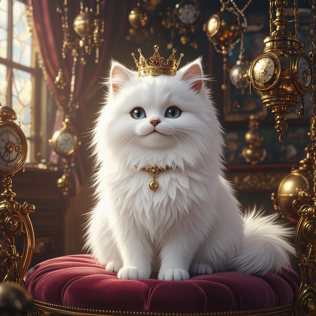 A captivating image of a white Samoyed cat with a crown, posed on a cushion amidst steampunk devices. Anime and steampunk elements combine in this detailed digital artwork with soft lighting.
