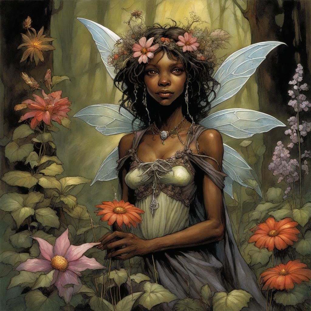 A beautiful dark-skinned fairy in a forest surrounded by flowers. The image has a whimsical, illustrative style reminiscent of classic fairy tale art.