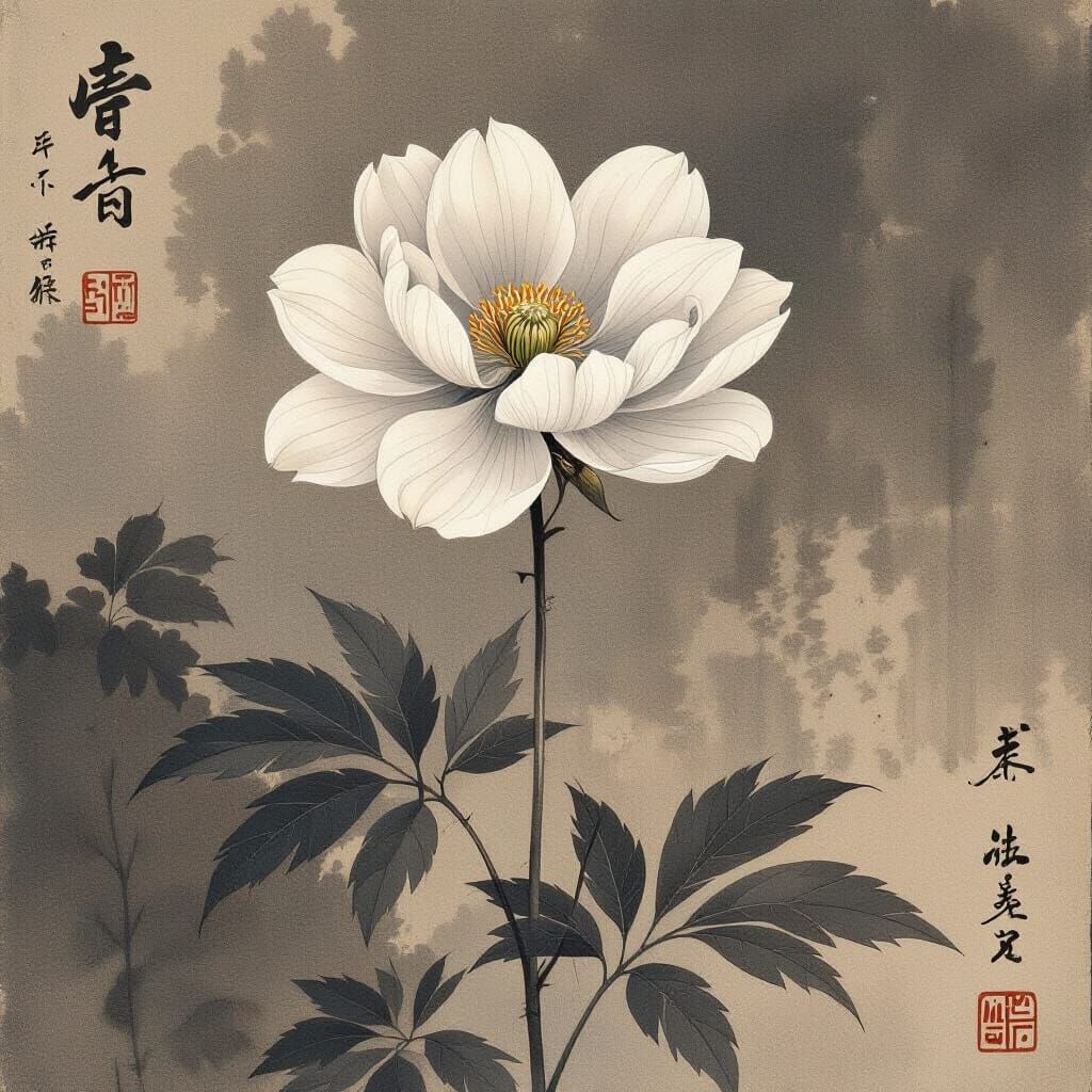 This image shows a single, fragile flower set against a tranquil, Japanese-style background. The artwork uses delicate oil and graphite textures to capture a feeling of serene beauty.