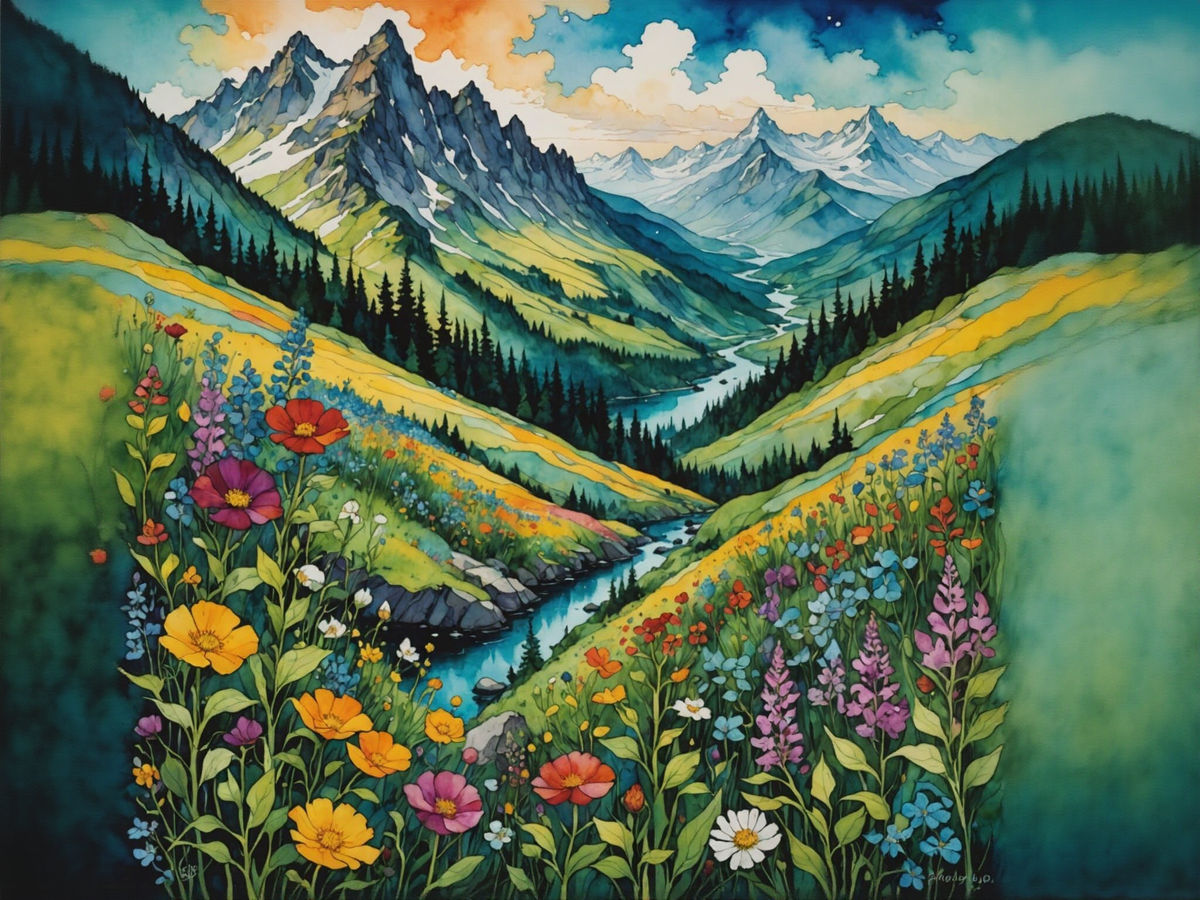 This vibrant image depicts a fantasy medieval landscape with colorful wildflowers and mountains, rendered in a detailed, artistic style.