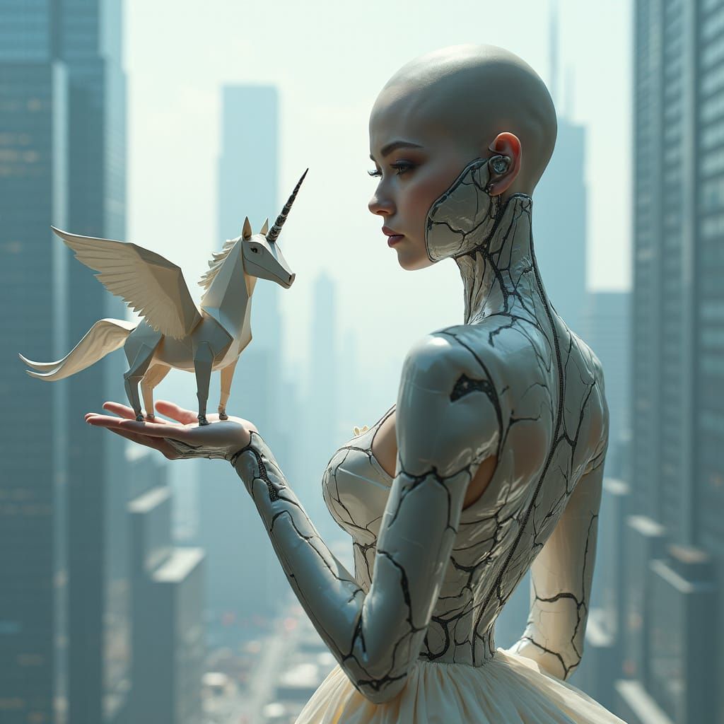 A photorealistic depiction of a stunning female cyborg in a flowing ball gown, gently cradling an origami unicorn on her palm, set against a vibrant urban backdrop of towering skyscrapers.