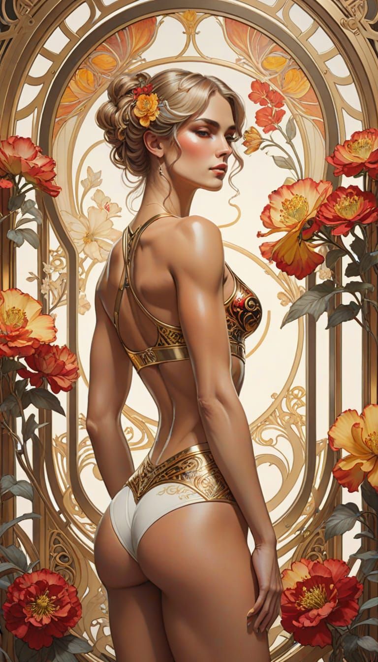 This image shows a young woman with a strong physique standing in a modern home gym, surrounded by delicate, curved lines and intricate details in an Art Nouveau-inspired watercolor painting with golden accents and red and yellow flowers