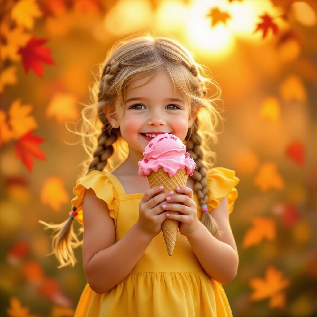 This image shows a fair-skinned girl in a yellow dress holding a pink ice cream cone, surrounded by autumn leaves under golden hour light. Rendered in a soft, painterly style.