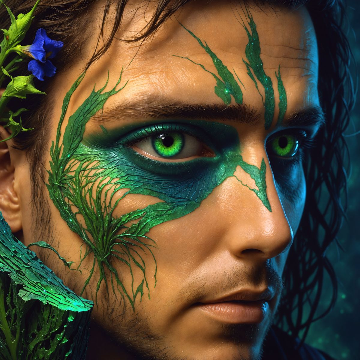 This captivating image shows a man with an intense gaze, his eyes emitting a vibrant bluish-green laser beam, surrounded by an ethereal aura, reminiscent of a dreamlike scene from the world of science fiction.