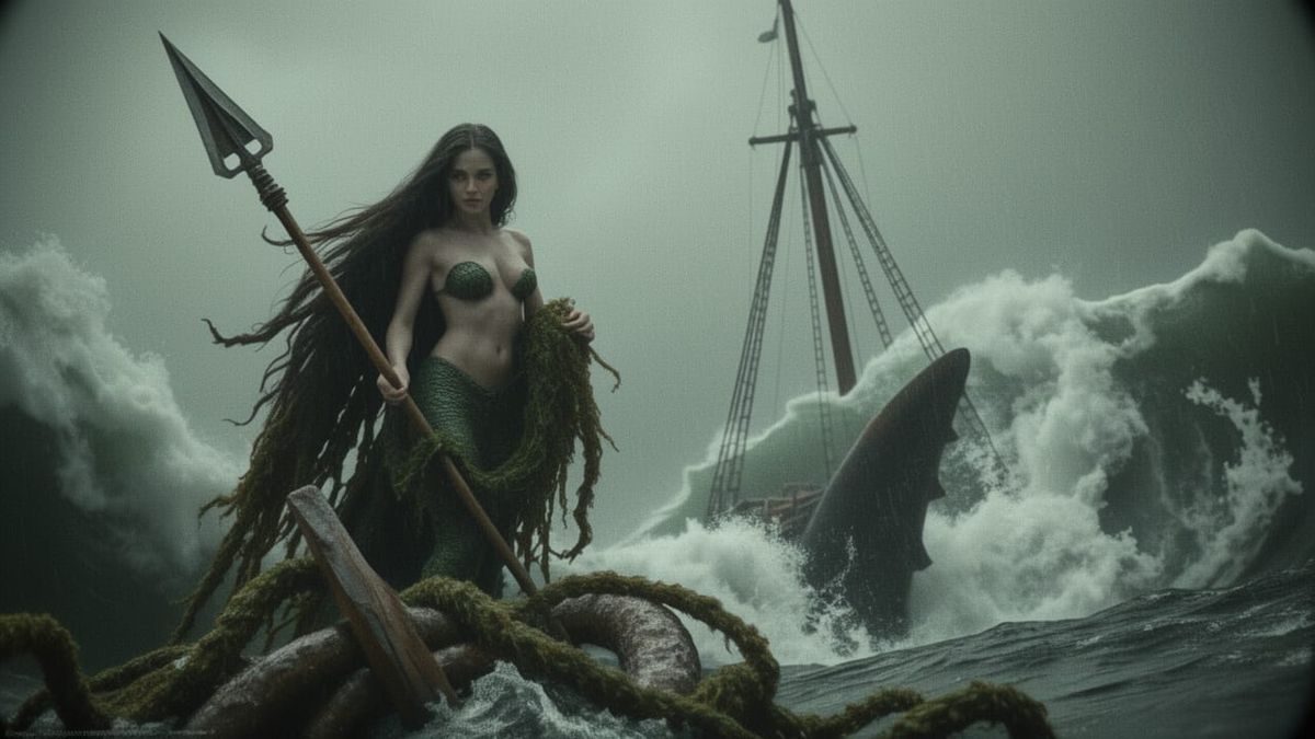 This cinematic image captures a menacing mermaid wielding a spear amidst a tempestuous, rain-swept ocean with a distant ship. Atmospheric and dramatic, it evokes a powerful, dark fantasy scene.