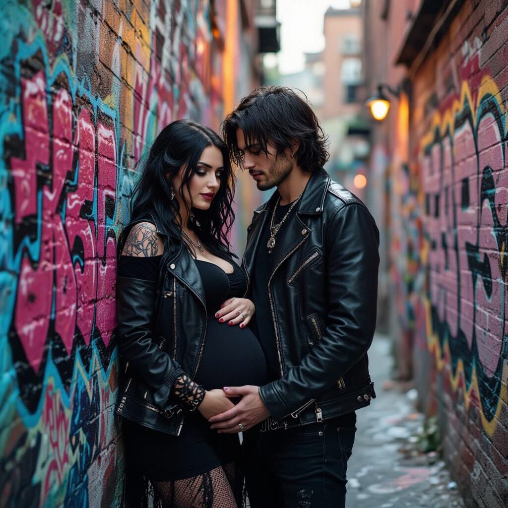 This image captures a candid moment of a gothic emo pregnant woman and her boyfriend in a colorful urban alley. The scene features dynamic spray paint textures and bold brush strokes with dramatic lighting.