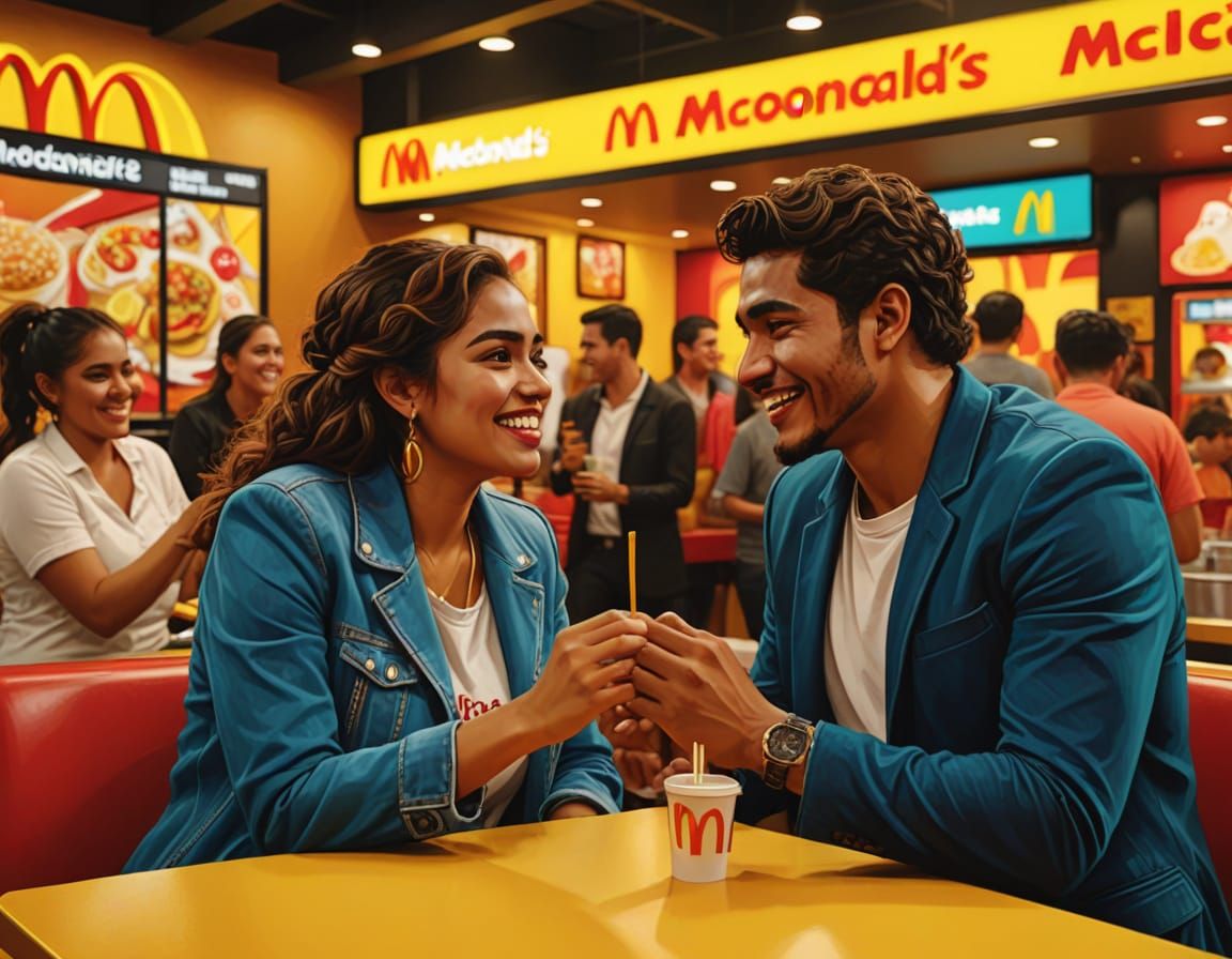 This image shows a marriage proposal in a McDonald's, with a Mexican man proposing to a Dominican woman. The digital art features bright colors, lively textures, and warm hues, inspired by street art.