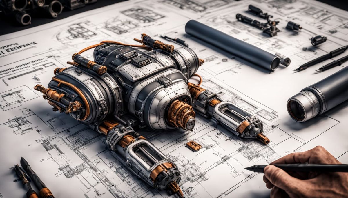 This image showcases hyperrealistic, intricately detailed blueprints for a jetpack. The composition is sharp, high-contrast, and cinematic, creating a moody, atmospheric visual.