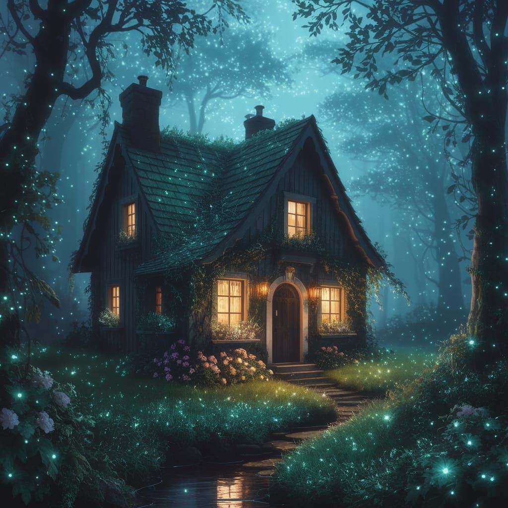 A captivating view of an overgrown cottage situated in a glowing forest. The scene is illuminated by bioluminescent flora and features a dense canopy and ethereal mist in a matte painting style.