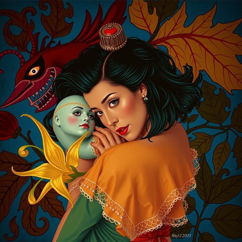 This surreal image depicts a chimaera of diverse figures, including a matador, harlequin, and characters inspired by the intricate style of Seraphinianus, set against a backdrop of green leaves, teal hair, a blue sky, and a yellow flower.