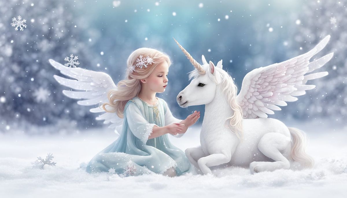 A whimsical winter scene of an angel and unicorn playing together in fresh snow. This image captures a magical and serene winter wonderland in dreamy watercolor style.
