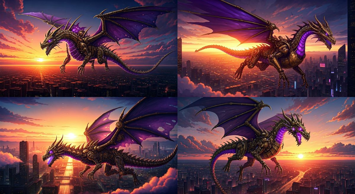 This vibrant digital painting depicts a majestic steampunk dragon flying above a cyberpunk cityscape at sunset, surrounded by warm golden and pink hues, with intricate gears and cogs visible on its body, and giant purple wings carrying it through the air.
