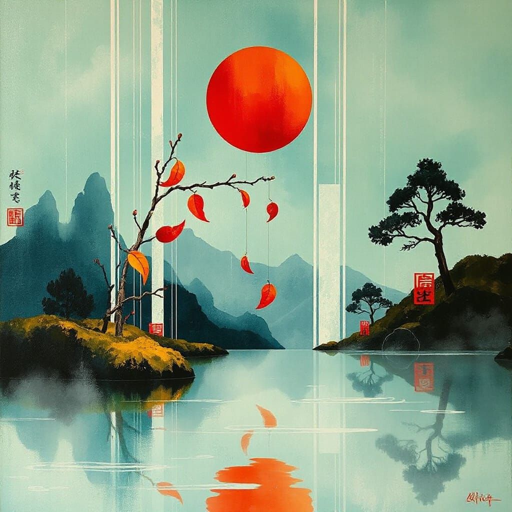 This dynamic artwork combines oil painted central elements with traditional ink wash landscapes, set against a soft misty teal background. A large, fiery red shape dominates the scene, while vibrant geometric forms and delicate sheet music collage elements dance through the air, imbuing the composition w...