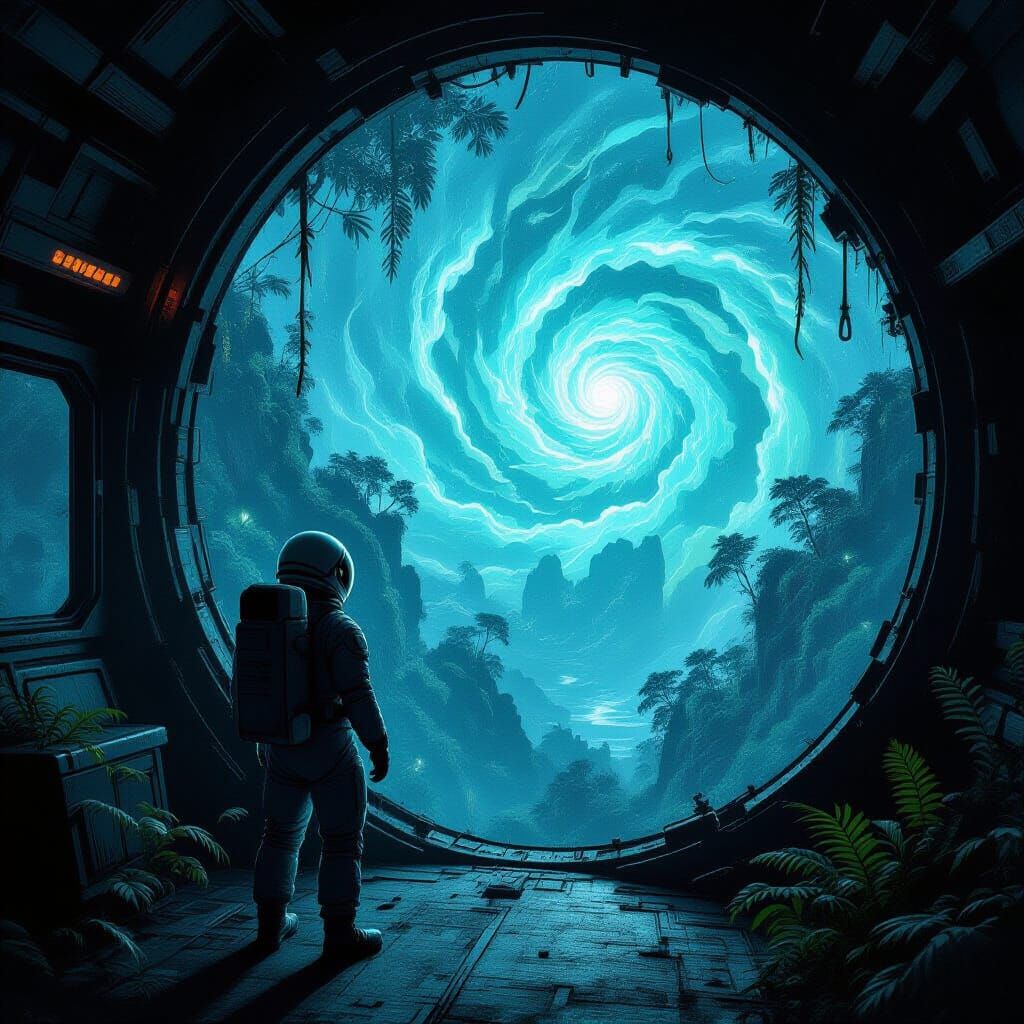 A lone astronaut, silhouetted against a swirling, bioluminescent alien jungle, contemplates the vastness of space from the observation deck of a derelict starship. Strange, glowing flora illuminates the scene with an ethereal light. The atmosphere is thick with mystery and the silence of deep space. Rendered with extreme color depth and the gritty texture of a charcoal drawing, emphasizing the isolation and wonder of discovery.