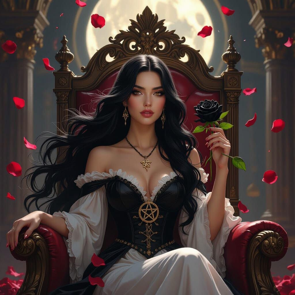 This image shows a goddess with long black hair and a pentagram necklace, seated on a throne holding a black rose. Rose petals fall as moonlight illuminates the Renaissance-style scene.
