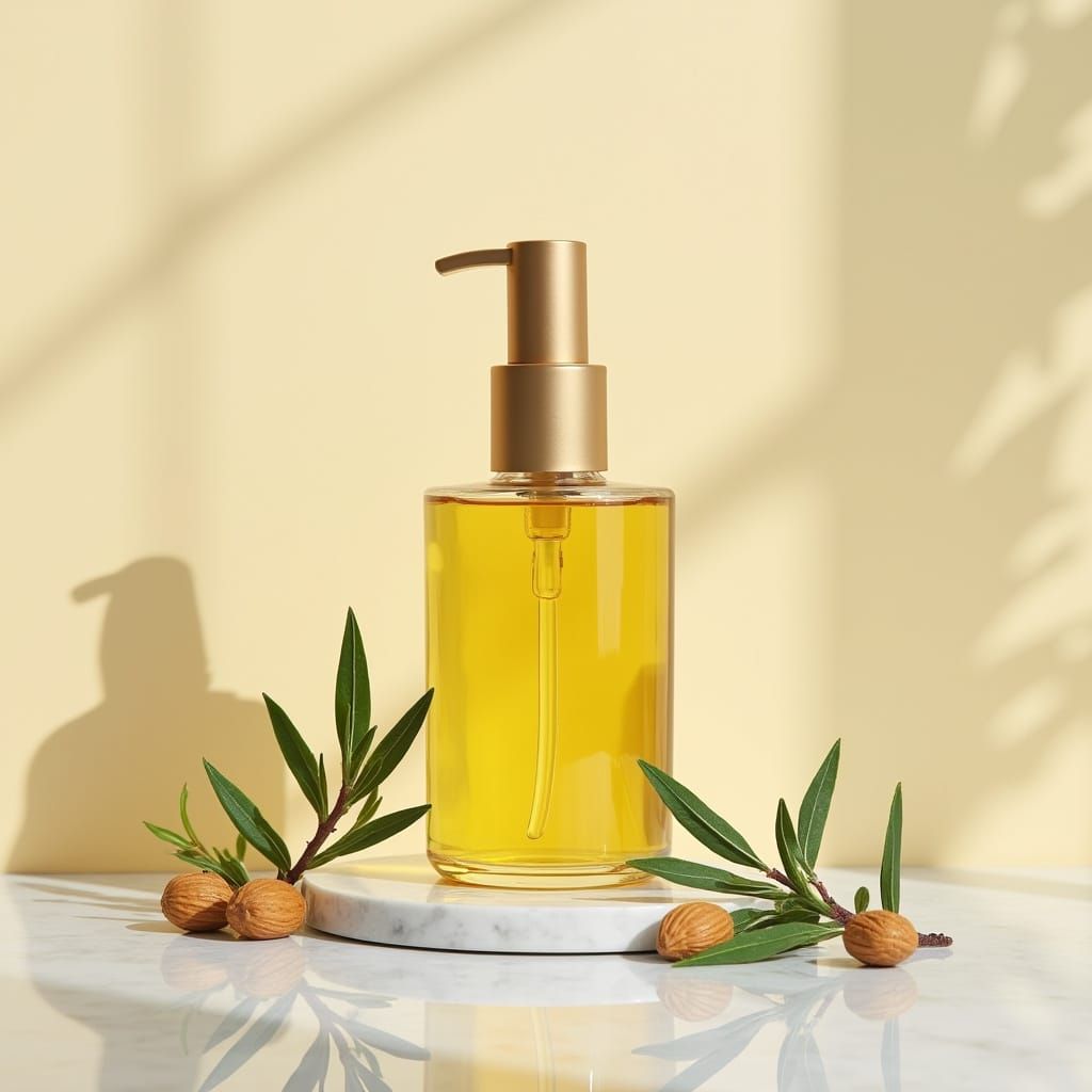 This image shows a luxurious hair oil bottle on marble with natural elements. The product photography features soft lighting and a minimalist luxury style with subtle pastel colors. The image has intricate textures.