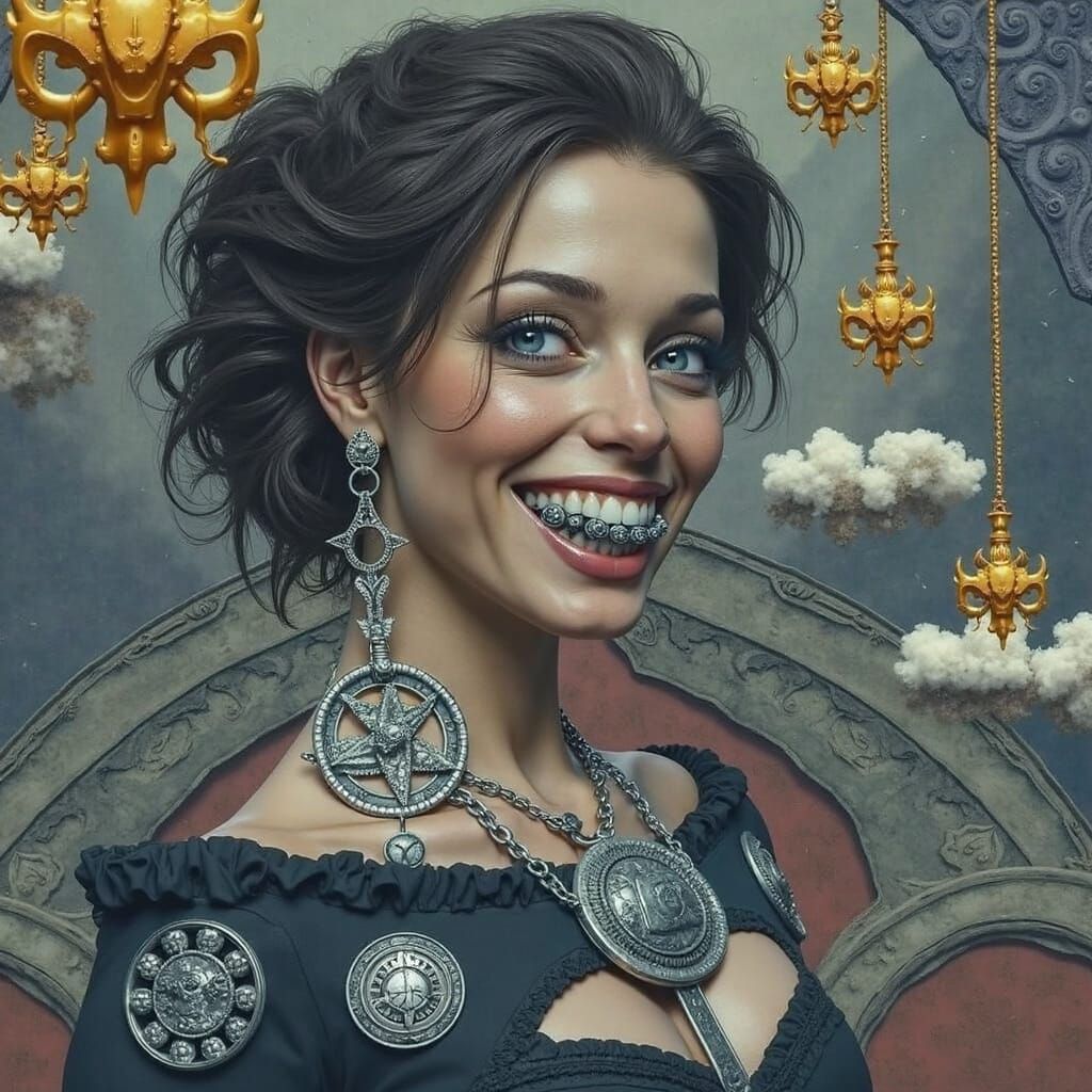 This image shows a woman with a large, ornate metal gag between her teeth, surrounded by mystical symbols and eerie accents, set against a rich, detailed backdrop of an ancient world, blending dark fantasy and sci-fi elements in a haunting, high-poly art style reminiscent of trending concept art on Artst...