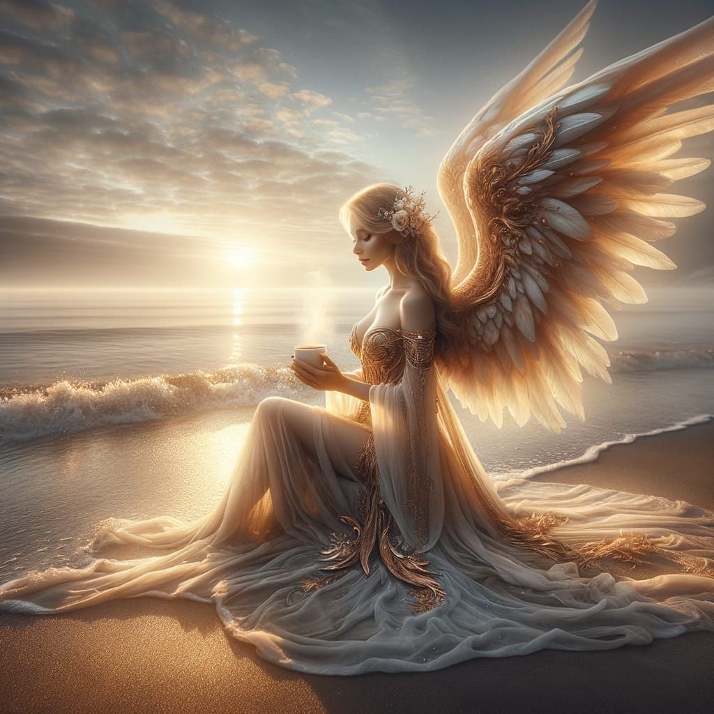 This image captures an ethereal angel with large wings, holding a steaming coffee cup on a tranquil beach at sunrise. The scene is bathed in a soft, golden morning glow.