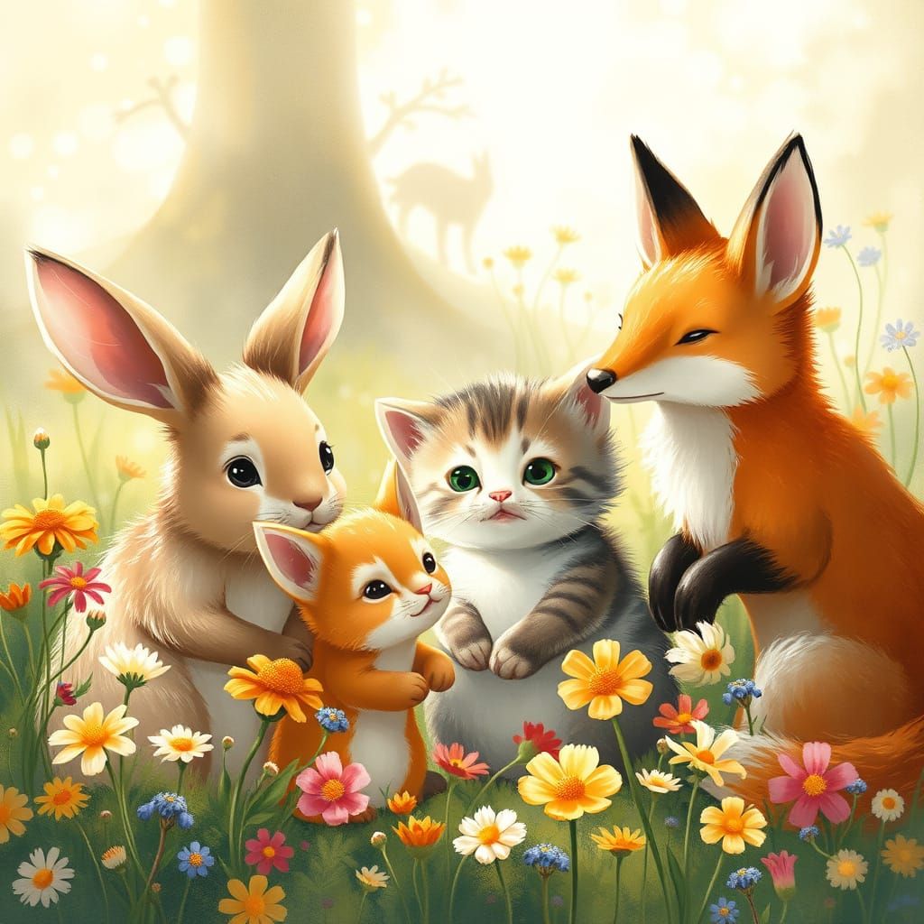 This charming illustration features a gathering of adorable animals in a lush meadow, with intricate details and textures reminiscent of classic children's book art, blending the whimsy of Beatrix Potter with the dreamy quality of Arthur Rackham's watercolors.