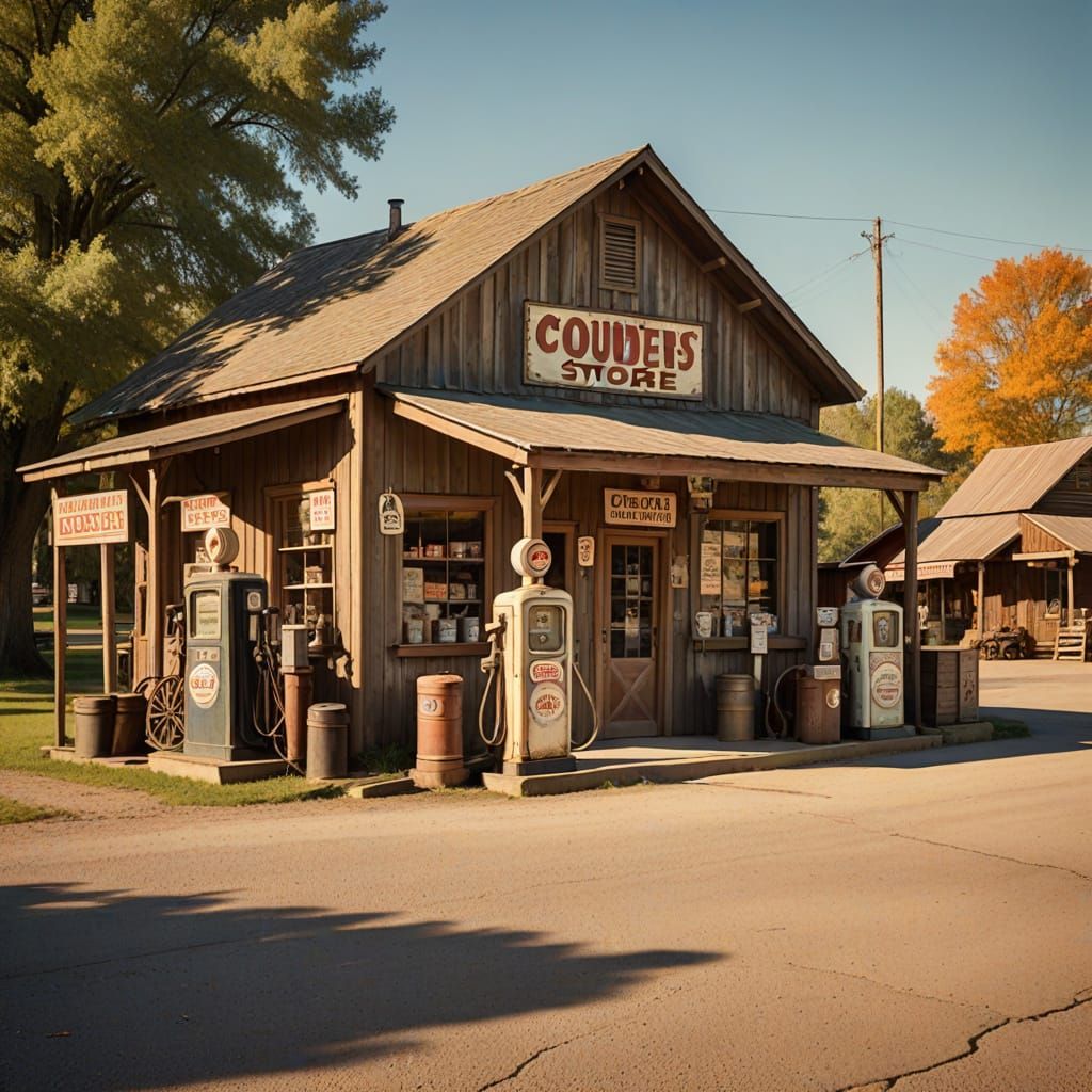 A wide shot of a vintage country store beside a road. The image evokes rustic American folk art with faded signs, vintage gas pumps and a warm color palette.