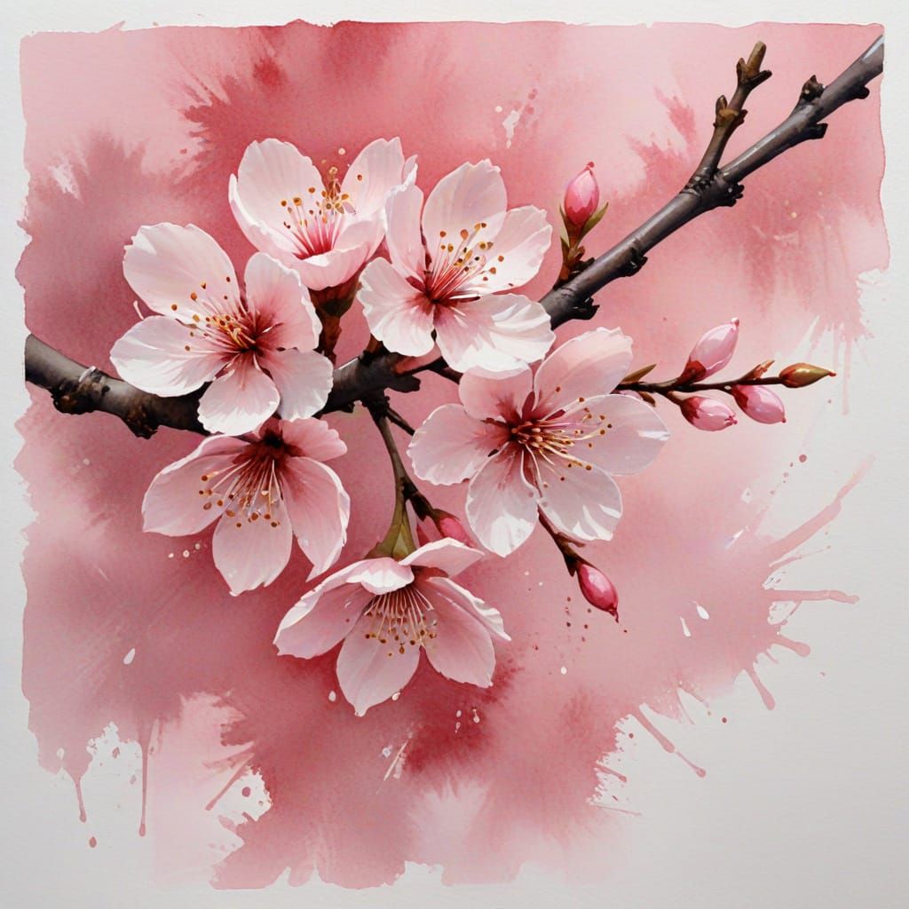 This image showcases a stunning watercolor painting of a cherry blossom branch with delicate pink petals, created using a Japanese-inspired brush style and featuring visible paper texture and botanical detail.