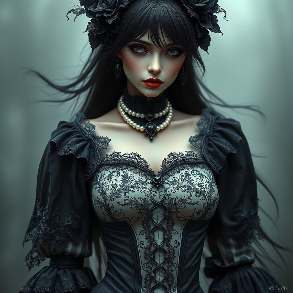 A striking picture of a woman in elaborate Victorian Gothic clothing with lace and pearls. The figure has long, dark hair and is set in a mystical, eerie atmosphere, reminiscent of digital art.