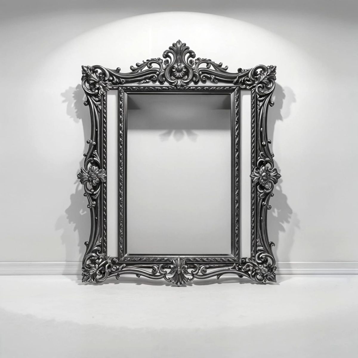 This image shows a minimalist picture frame standing alone in a vast, empty gallery, surrounded by soft, moody lighting and high contrast monochrome tones.