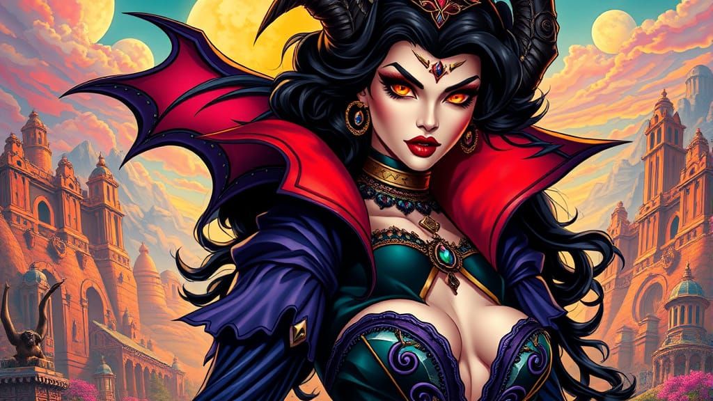 A striking picture of a vampire woman in elaborate cosplay. She stands confidently against a fantastical landscape backdrop, in a vibrant and detailed comic book art style.
