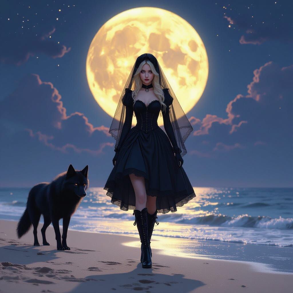 This dark fantasy concept art shows Alice in Wonderland in a black wedding dress and boots walking a black wolf on a beach under a full moon, rendered with dynamic lighting.