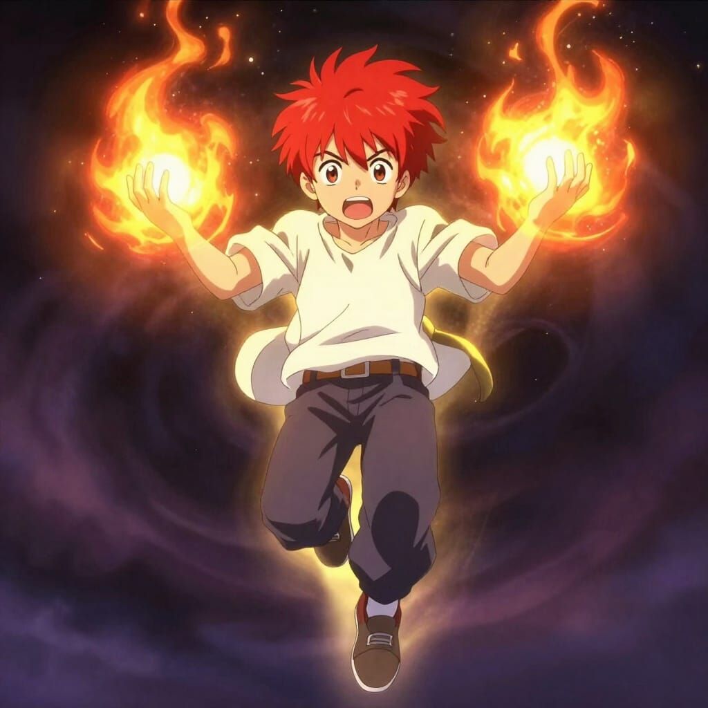 This image shows a young boy with red hair floating, holding glowing fire orbs. Rendered in a vibrant anime style with dramatic lighting and intense movement.