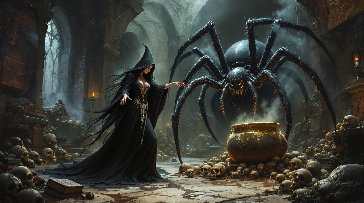 This image shows a dark witch in a sprawling chamber casting spells with her spider companion. The scene features mystical ambiance, a cauldron, and magical artifacts, rendered in a dark fantasy style.