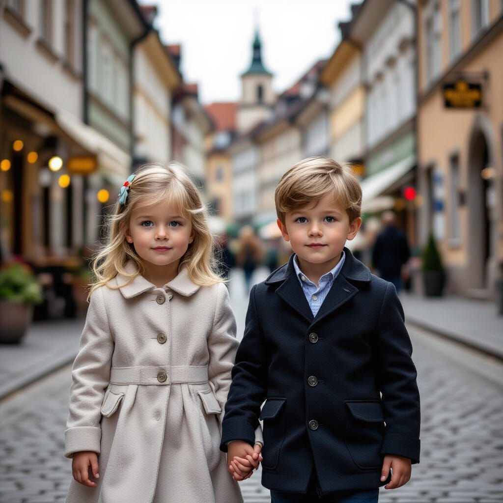 Close-up portrait of a young girl and boy holding hands while walking through Dvůr Králové. Photorealistic style with shallow depth of field, capturing skin texture and emotional connection.
