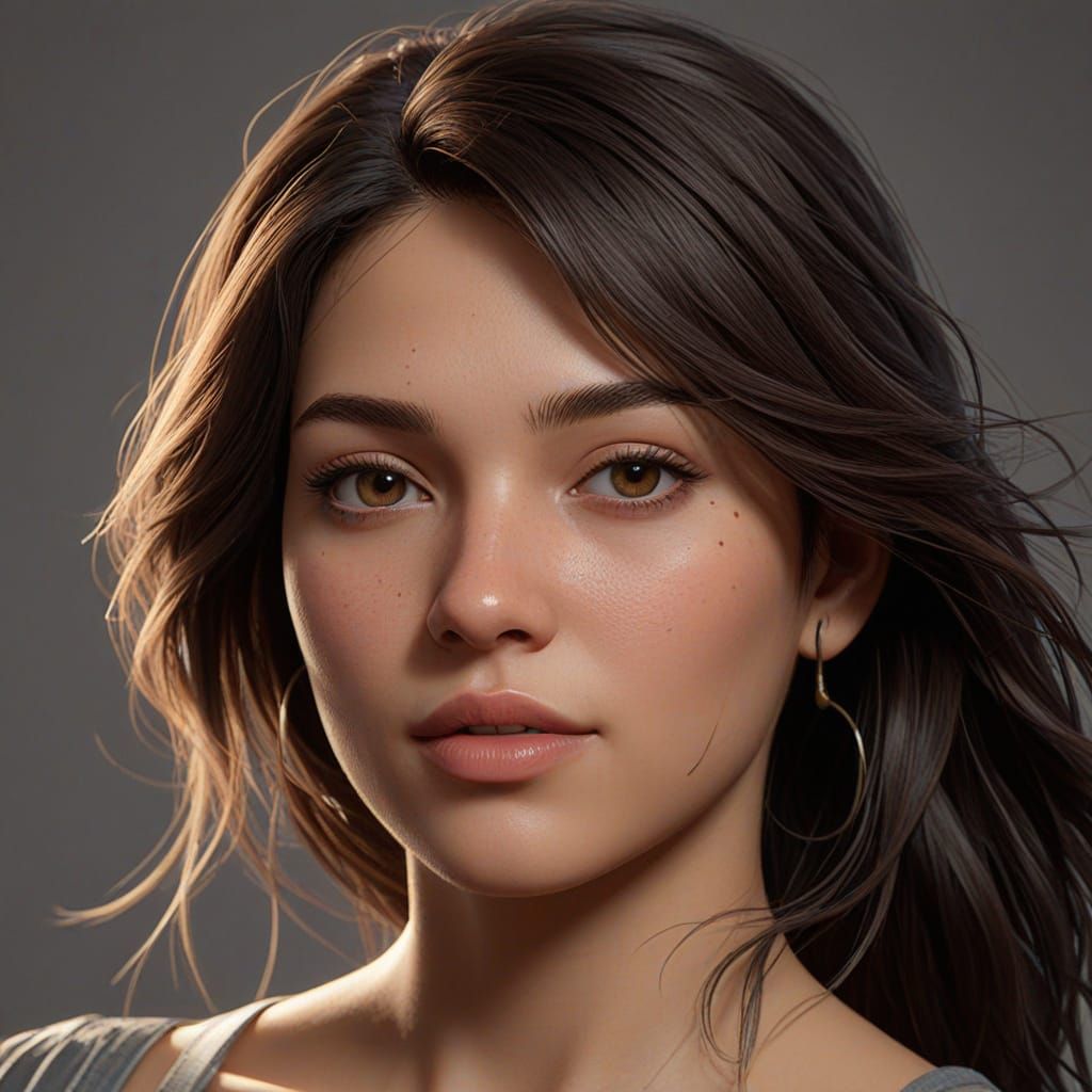 This striking portrait shows a beautiful dark-haired woman with expressive light-brown eyes and defined eyebrows, gazing off to her right side. Created in 8k resolution, this concept art features dynamic lighting and intricate details, blending the styles of Artgerm and Alphonse Mucha with modern Unreal ...