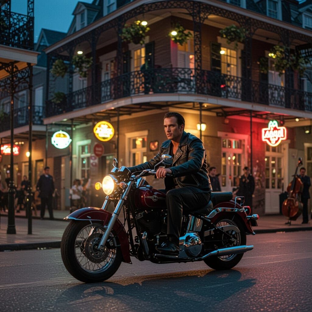 This image shows a young man on a motorcycle in New Orleans' French Quarter at night. The picture evokes classic Hollywood and film noir aesthetics through gritty realism.