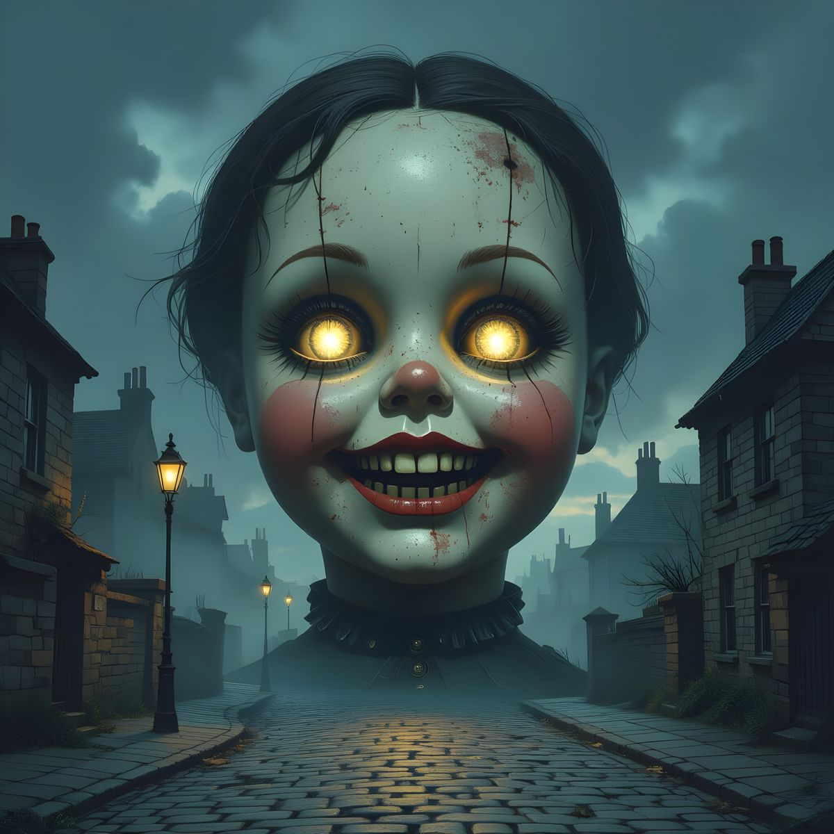 This image shows a huge, antique doll head with glowing eyes in a deserted Victorian street. The scene, reminiscent of vintage art etchings, uses stark lines and desaturated colors to convey isolation and dread.