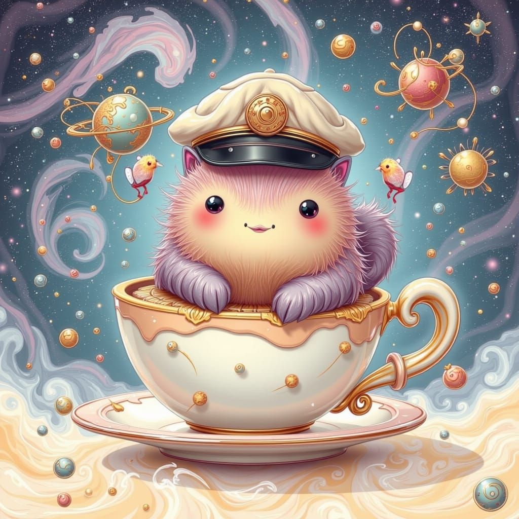 A charming watercolor image of a fluffy tardigrade captaining a teacup through a cosmic latte art universe. Gentle pastels and diffused light create a serene, whimsical scene.