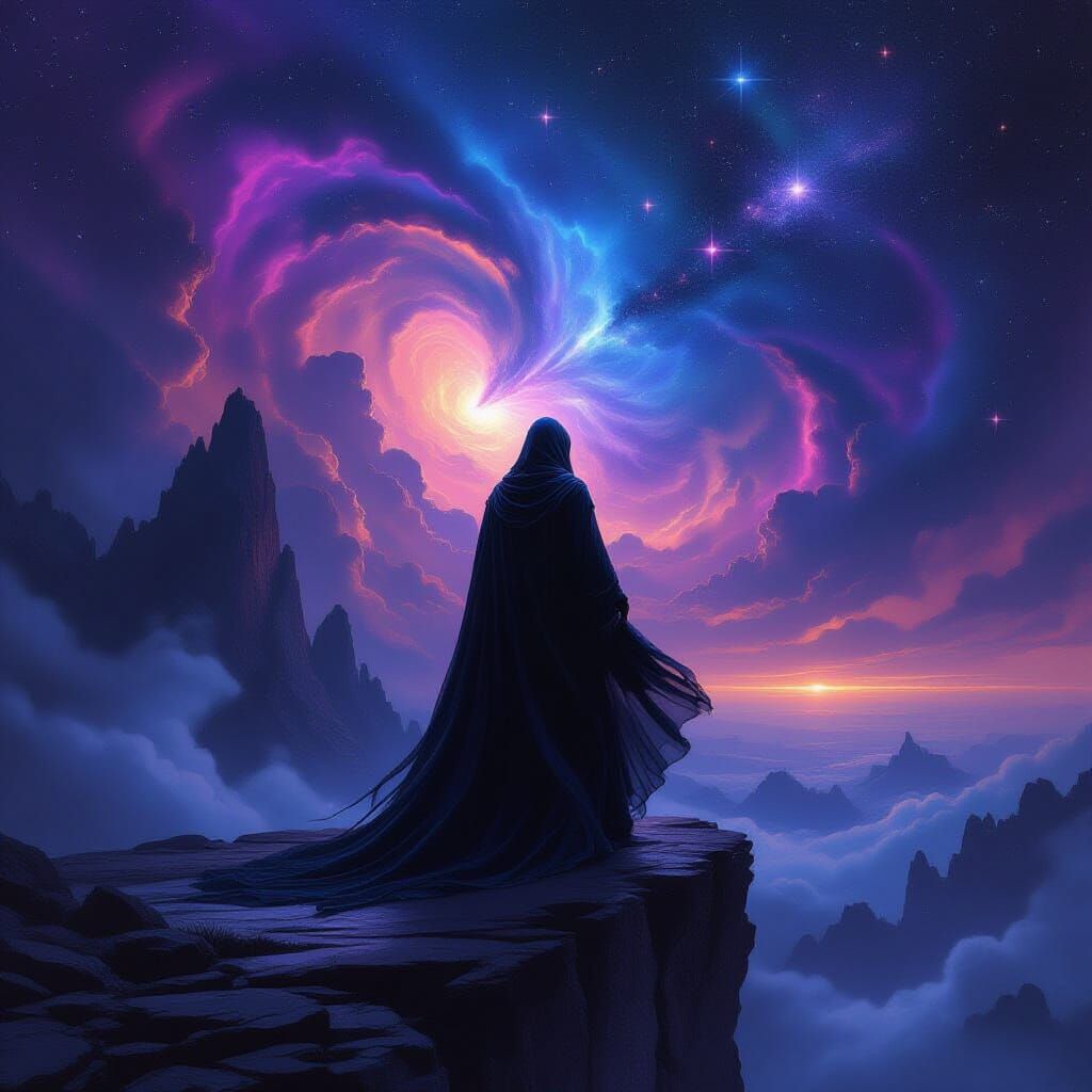 This image depicts a shadowy figure in dark robes on a precipice, gazing at a cosmic vista with swirling stars and nebulae. Rendered with dramatic lighting and deep colors, it evokes dark mystery and unsettling beauty.