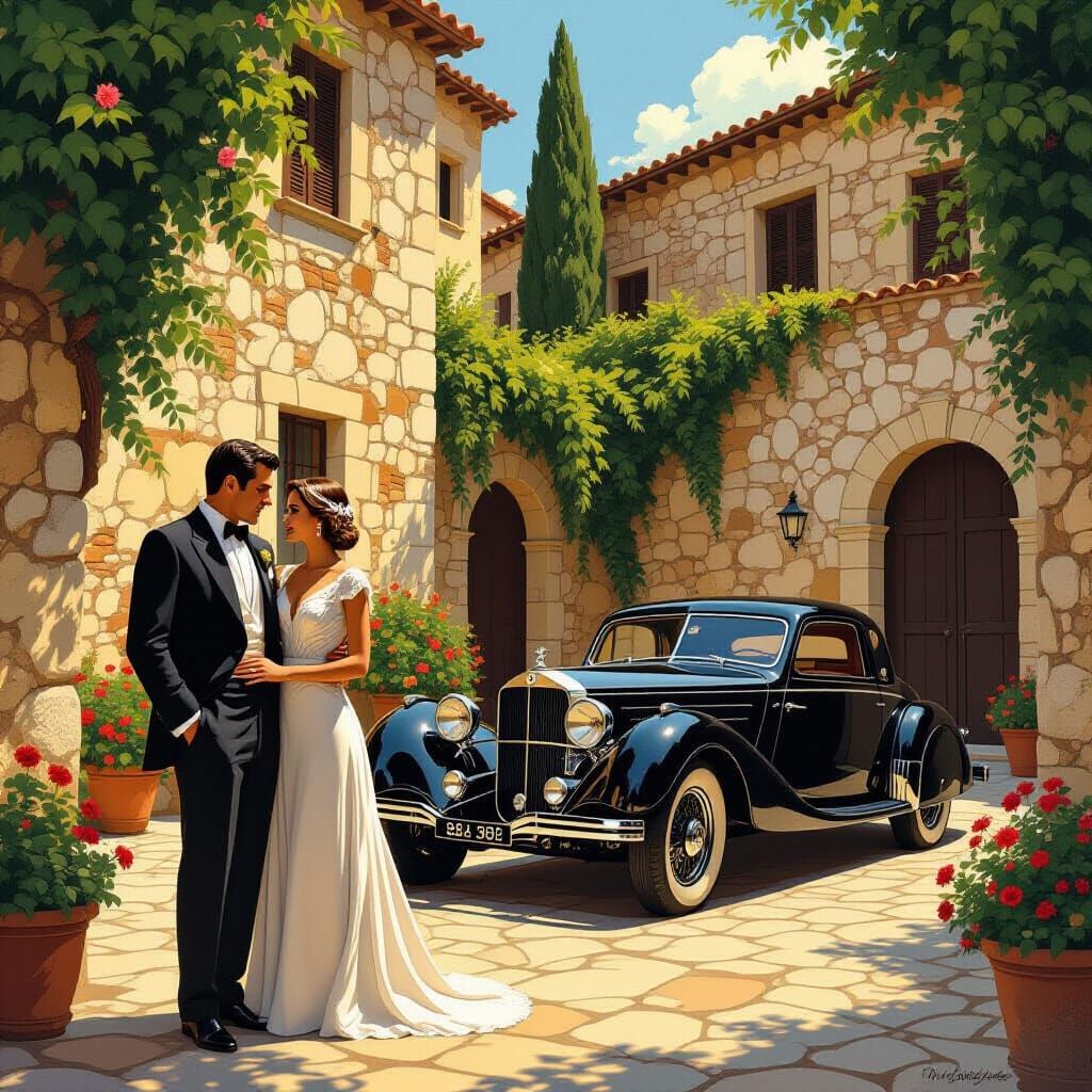 A captivating image of Michael Corleone and Apollonia in 1930s Sicily. The couple stands in a courtyard with a black Alfa Romeo. The scene is rendered with warm lighting and intricate illustrative details.