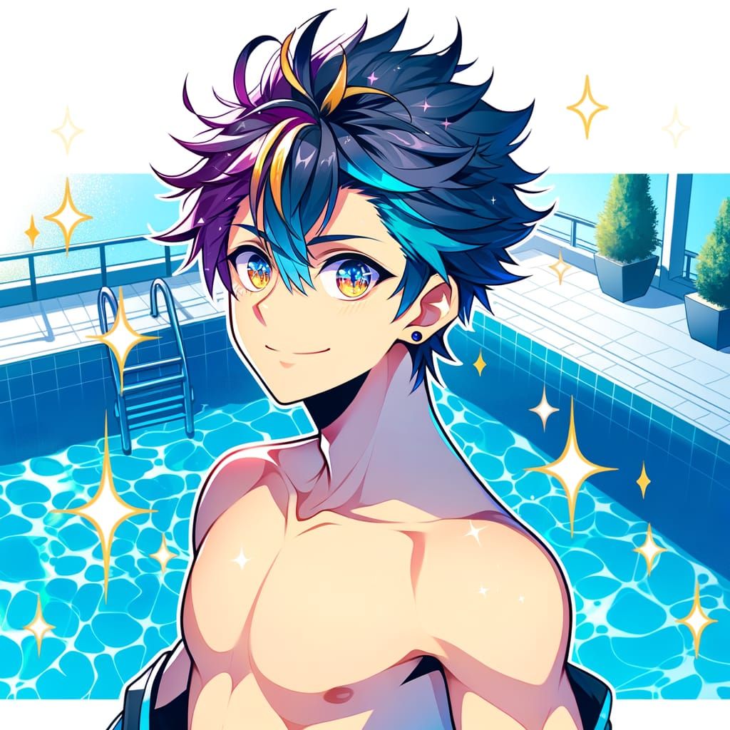 This illustration shows a young anime-style character with spikey, bright hair standing by a sparkling pool. He is wearing men's swimwear, ready for a swim under bright sunshine.