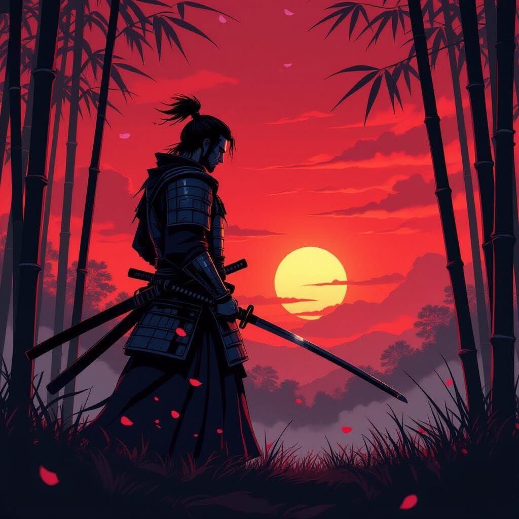 This image shows a lone samurai silhouetted against a red sunset, katana in hand. The art style evokes classic manga with bold lines, dramatic shadows and cel-shading. A visually striking, cinematic scene.