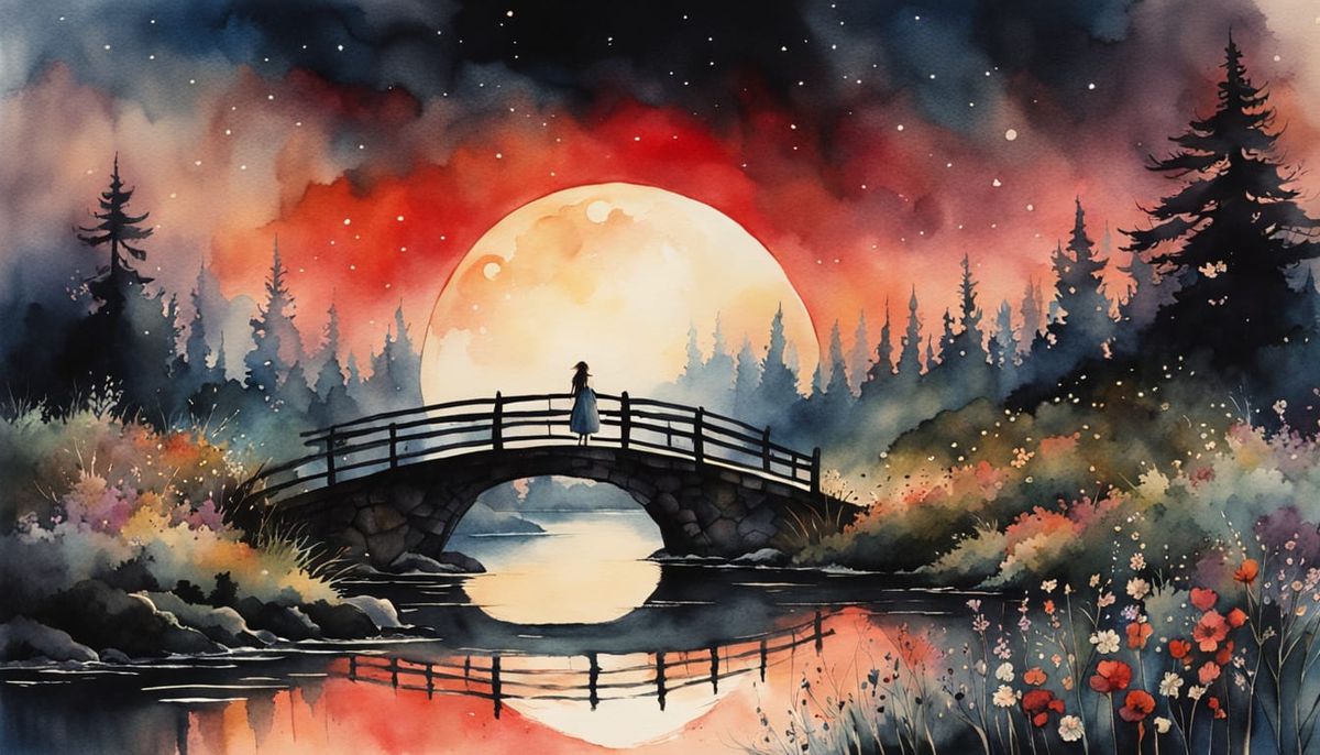 This enchanting watercolor painting depicts a captivating lady standing on a bridge surrounded by wildflowers, bathed in the soft, warm light of a red sunrise during a dark eclipse.
