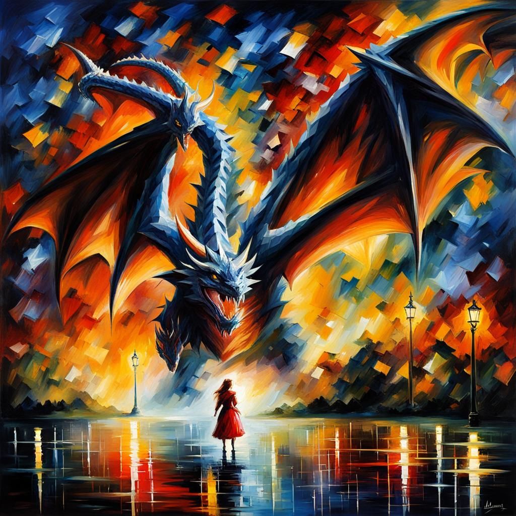 A dramatic image of a princess encountering a dragon at night. The artwork evokes the style of Leonid Afremov, with vibrant colors and textured brushstrokes.