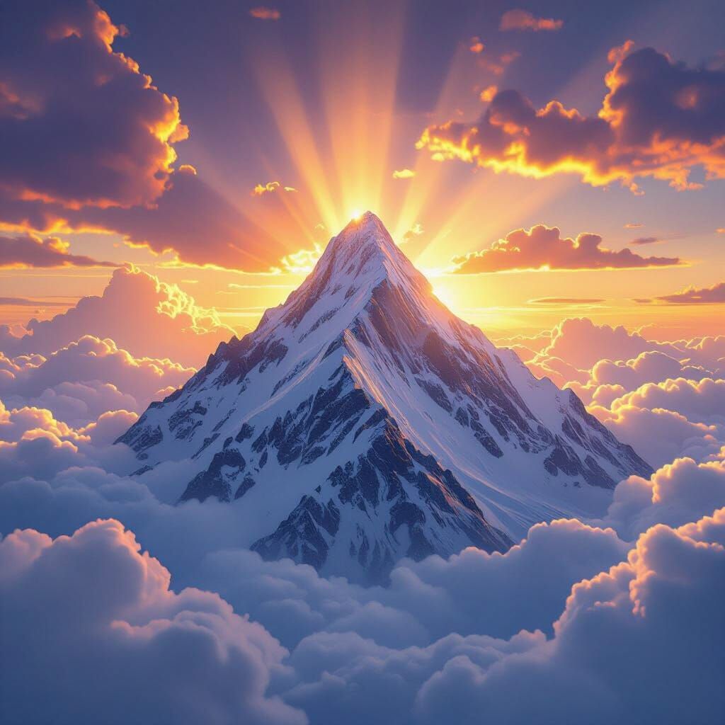 A breathtaking image of a crystal mountain towering over clouds during sunset. The sky is awash with vibrant colors, and light rays pierce the clouds in a hyperrealistic style.