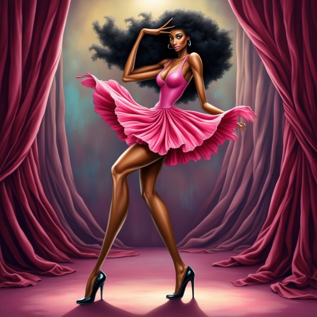 This image shows a Black woman dancing on stage. She has long, black hair and is wearing a pink feather and sequin outfit with black heels. The illustration has a cabaret style.