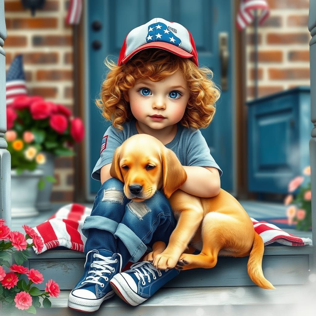 a little girl strawberry blonde curly hair, blue eyes, freckles, wearing cropped blue jeans with patriotic patches, T-shirt, baseball cap turned sideways, blue print patriotic high top sneakers, snuggling her golden retriever puppy, sitting on a patriotic blanket, on a front porch step on a patriotic  blanket, old wooden blue door behind, them with brick on the house, BG, patriotic,blurred flowers Watercolor.
