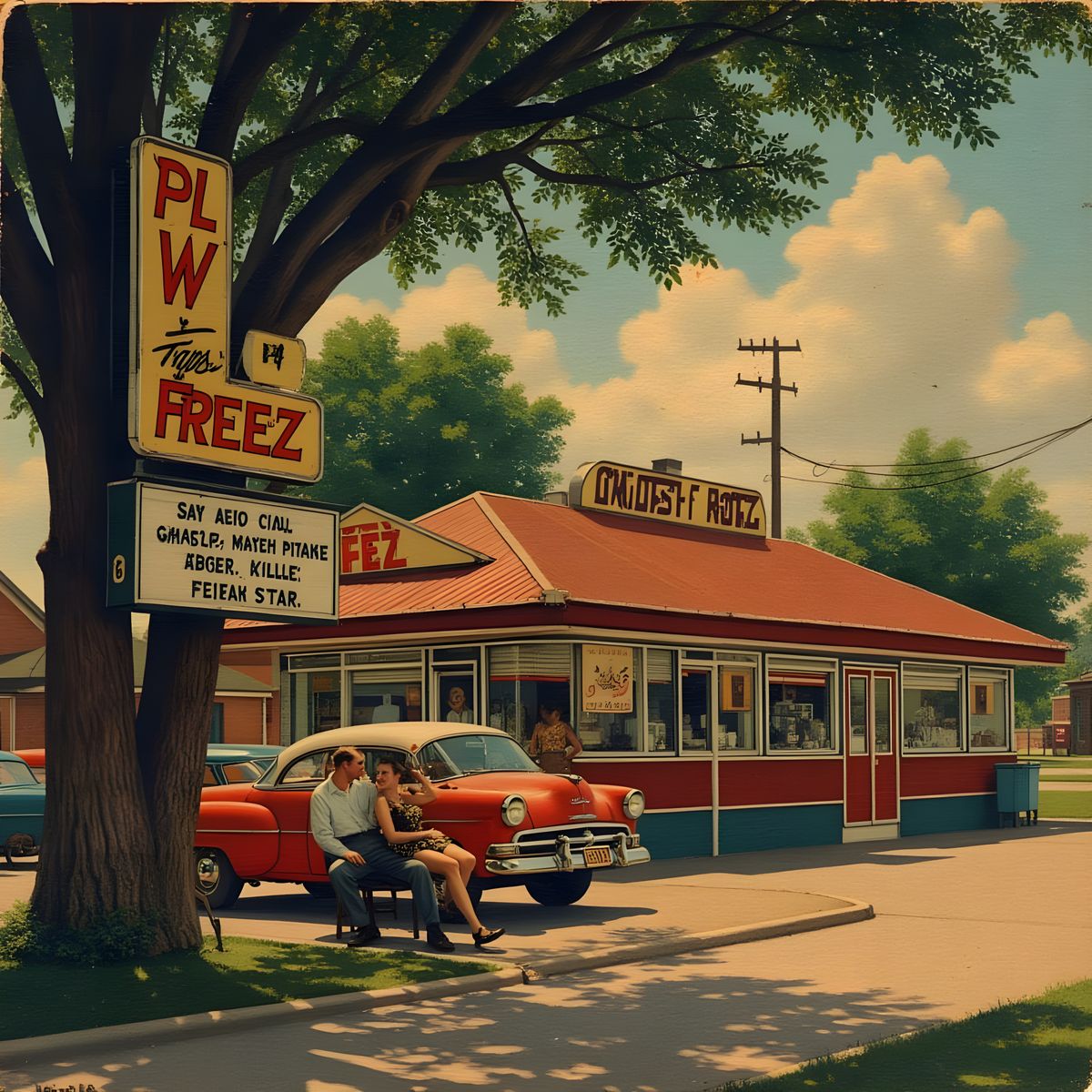 Generate unique retro diner images for free! Easily create your own 1950s scenes with our AI image generator.