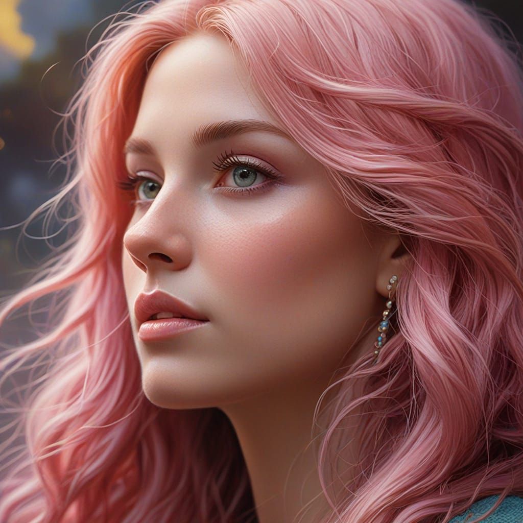 A close-up oil painting of a coin featuring a beautiful woman with long pink hair. The artwork is bathed in golden light and ethereal mist, creating a dreamy and serene atmosphere, reminiscent of fantasy art.