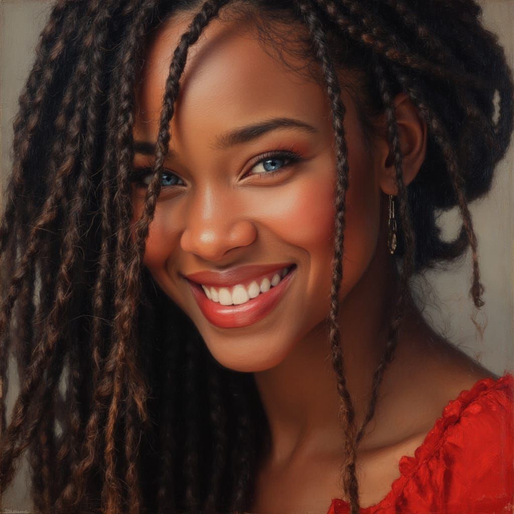 This image shows a stunning portrait of a woman as an African Goddess, with intricate braided hair and captivating blue eyes, presented in a realistic studio photography style with soft lighting, reminiscent of Vogue covers.