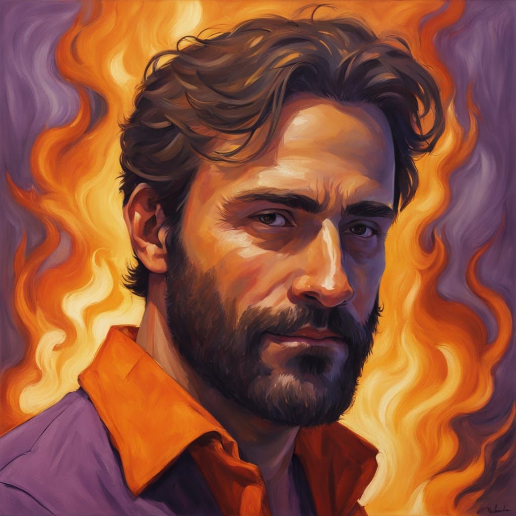 A striking picture of a smiling man with a beard, wearing orange and violet linen clothes. Golden walls engulfed in flames surround him in a surreal, dreamlike vivid oil painting with warm colors.