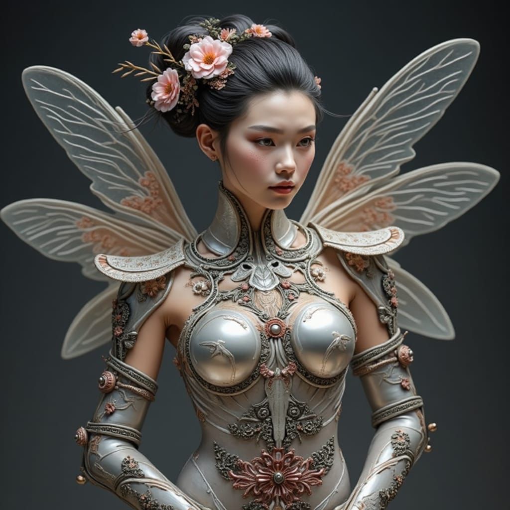 This image shows a beautiful cyborg geisha with floral etchings and woven circuits. The hyperrealistic art features a delicate, futuristic aesthetic and traditional hairstyle, set in a whimsical setting.